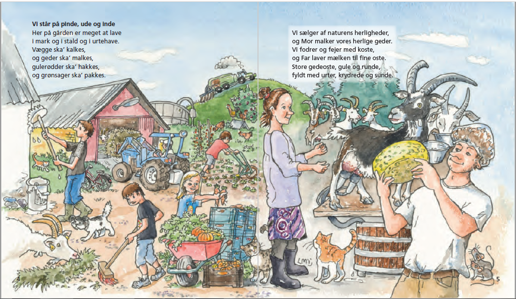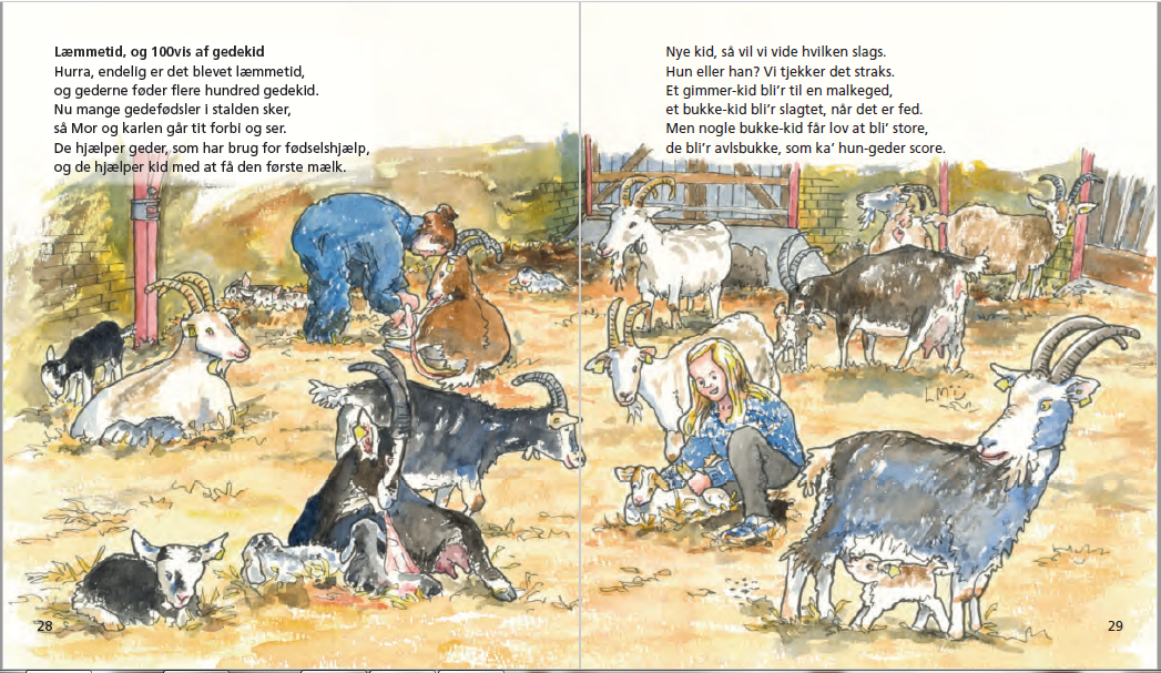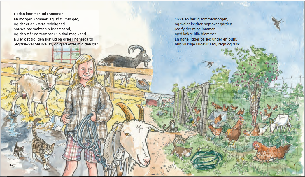 FAKTA: Ninke og geden er fra 2015, 36 sider, format 18 x 20,5 cm. Akvarelbilleder og trykt på svanemærket papir, i solid dansk kvalitet med hårdt bind og smudsafvisende sider.