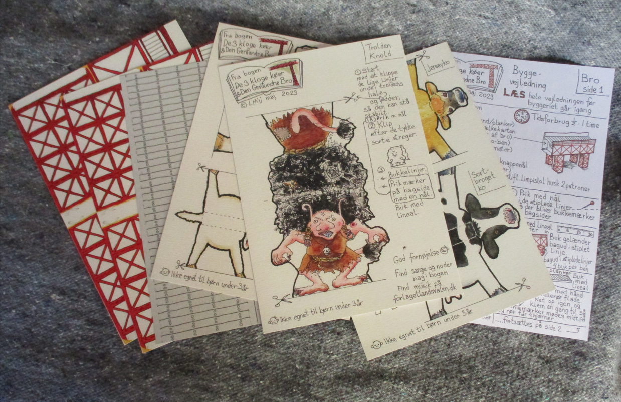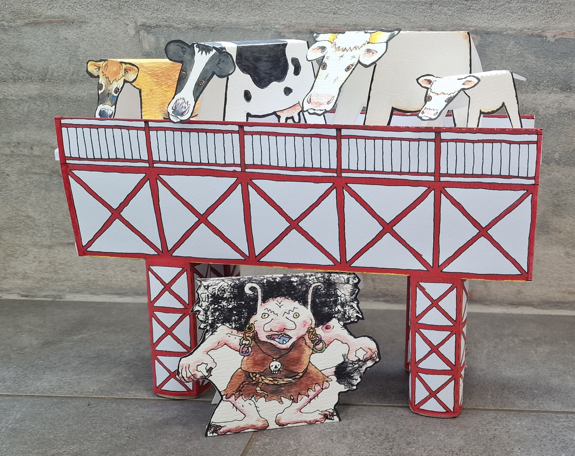 Byggesæt til bogen De 3 kloge køer & Den Genfundne Bro Klippeark med bro + trold + køer + kalv