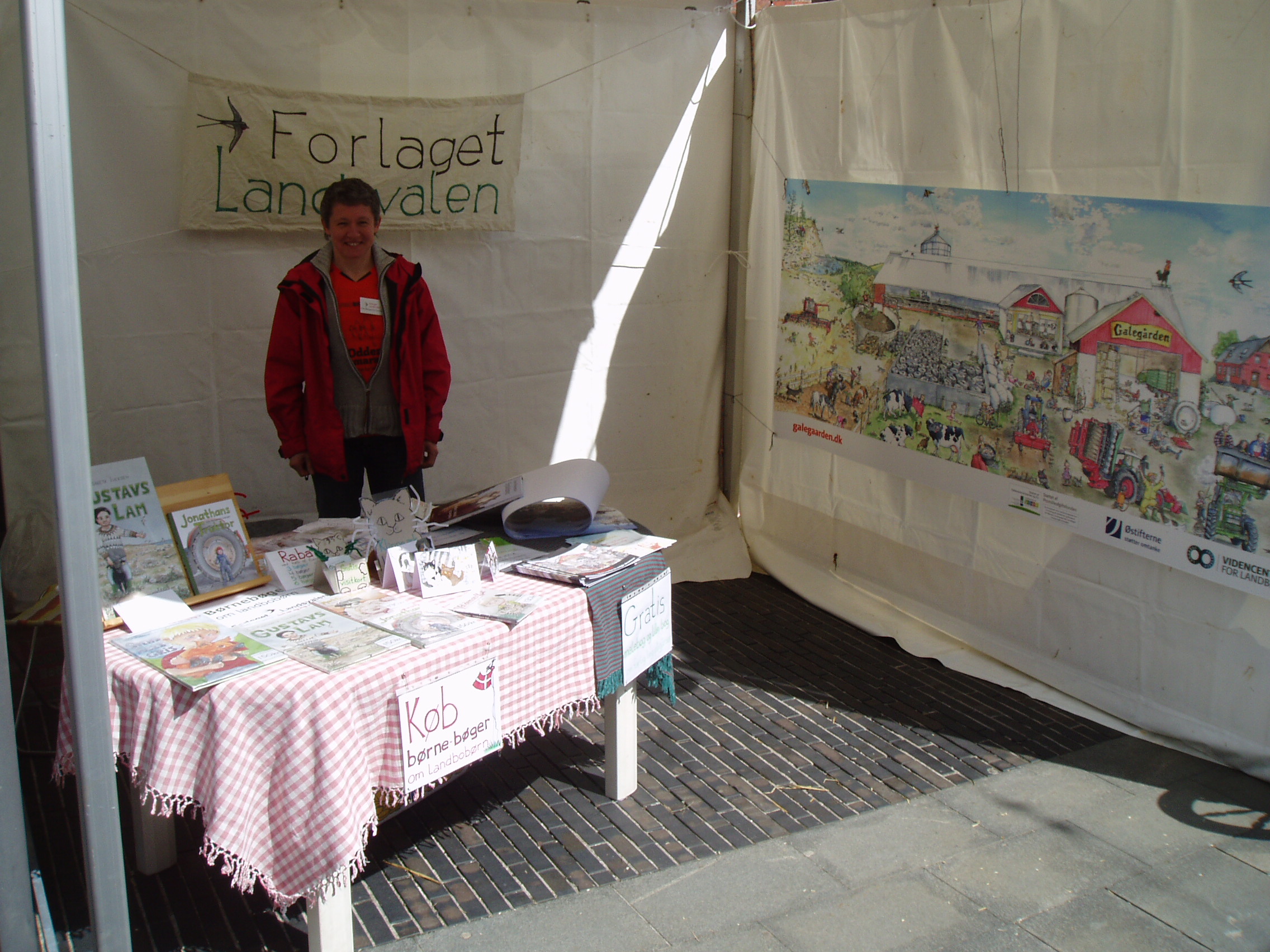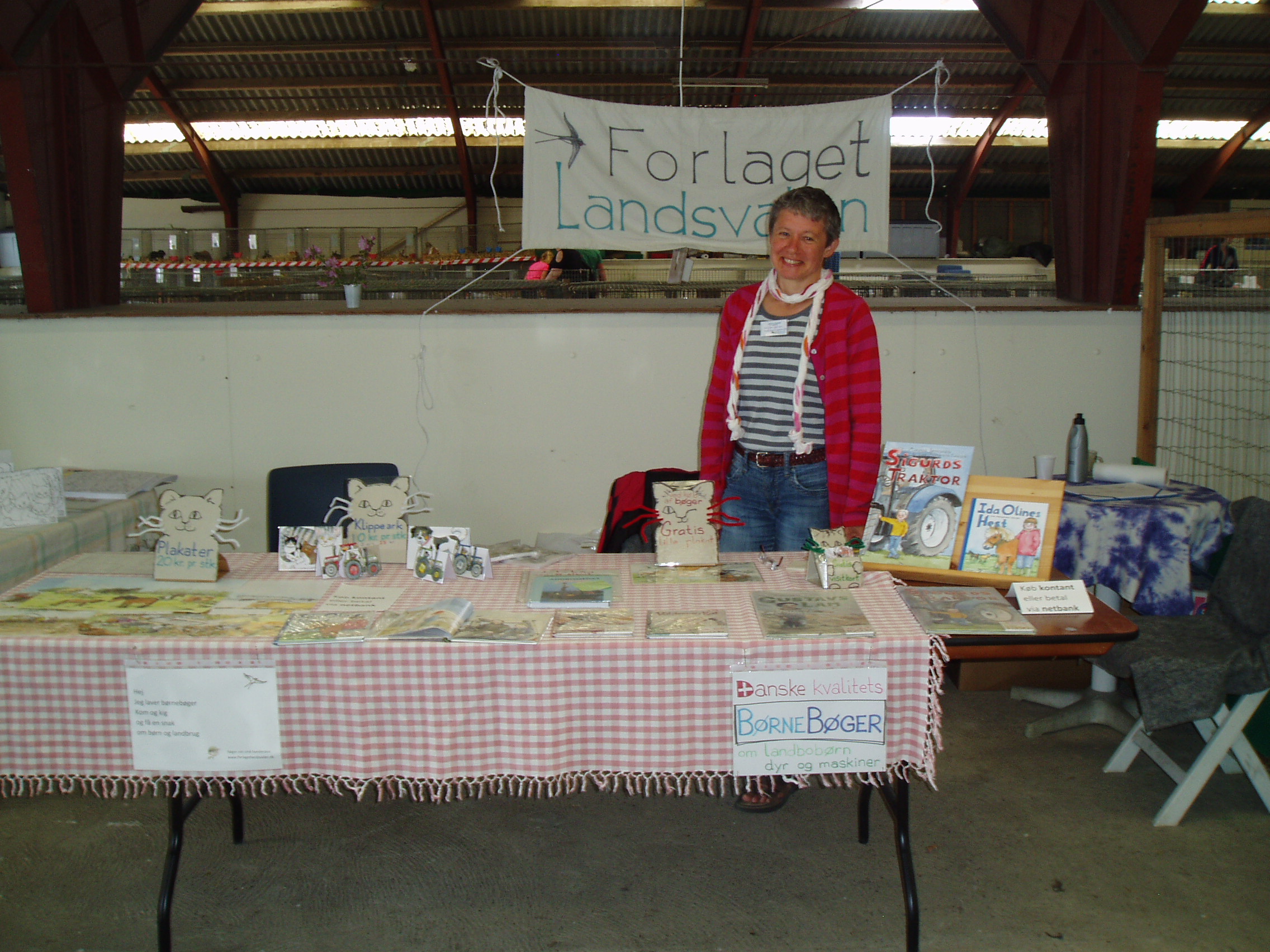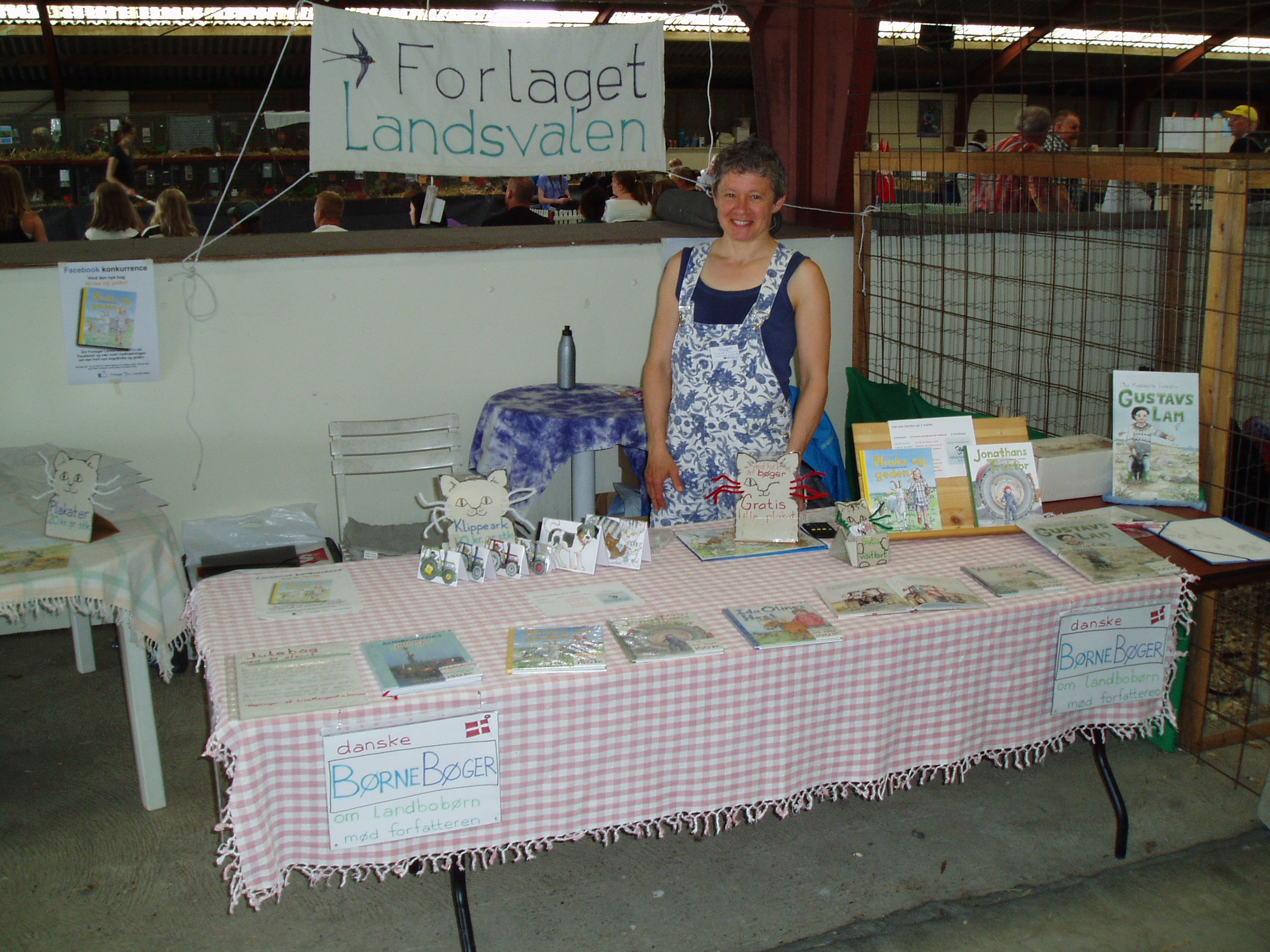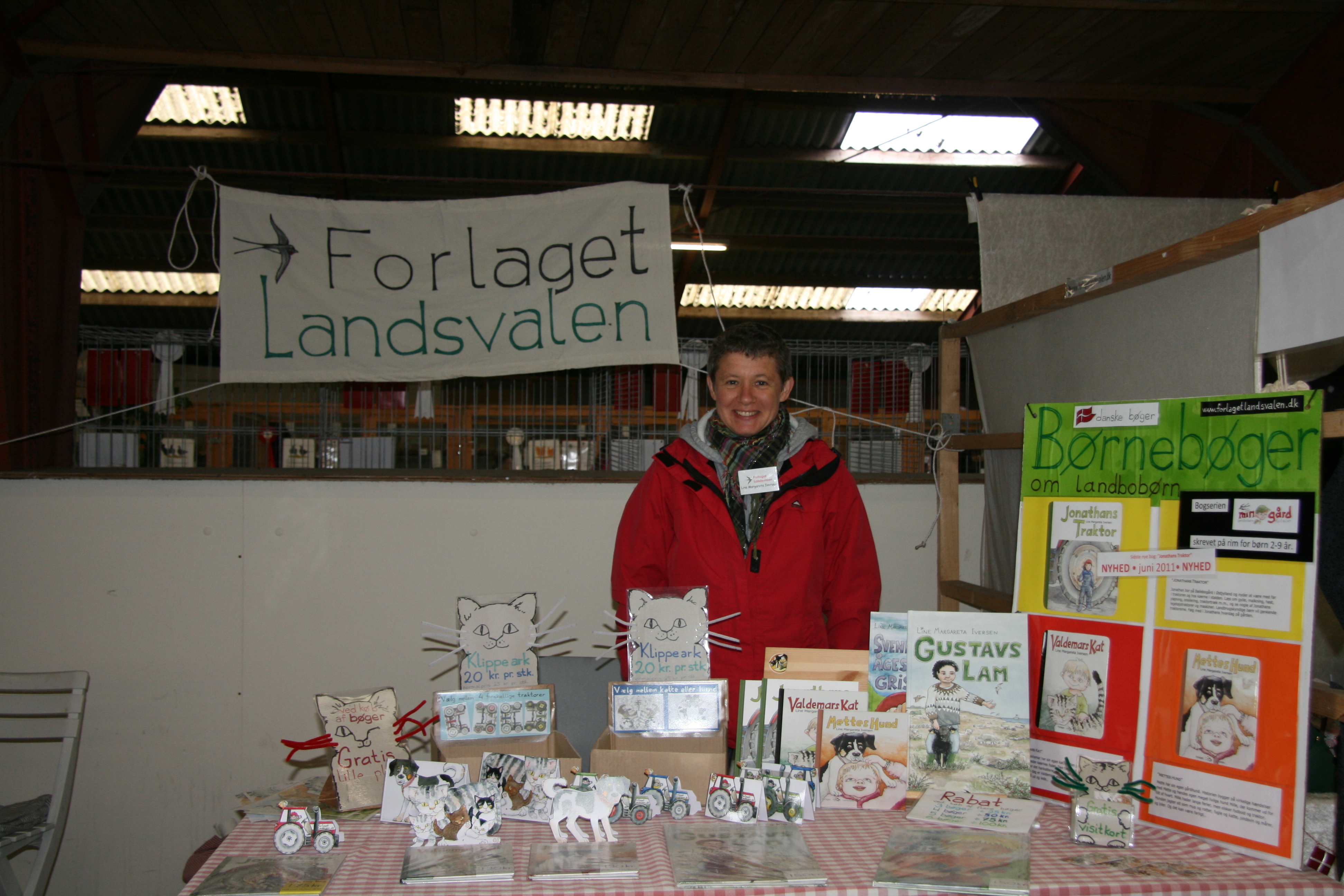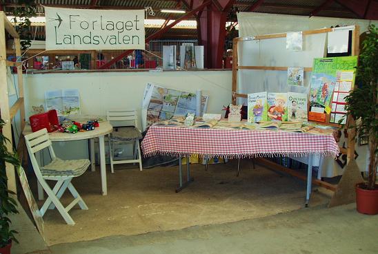 Forlaget Landsvalens stand på Livsstilsmarkedet, der havde til huse mellem staldene med brægende får og lam og stalden med kaglende høns, galende haner, pludrende klakuner, samt de mere stilfærdige kaniner.