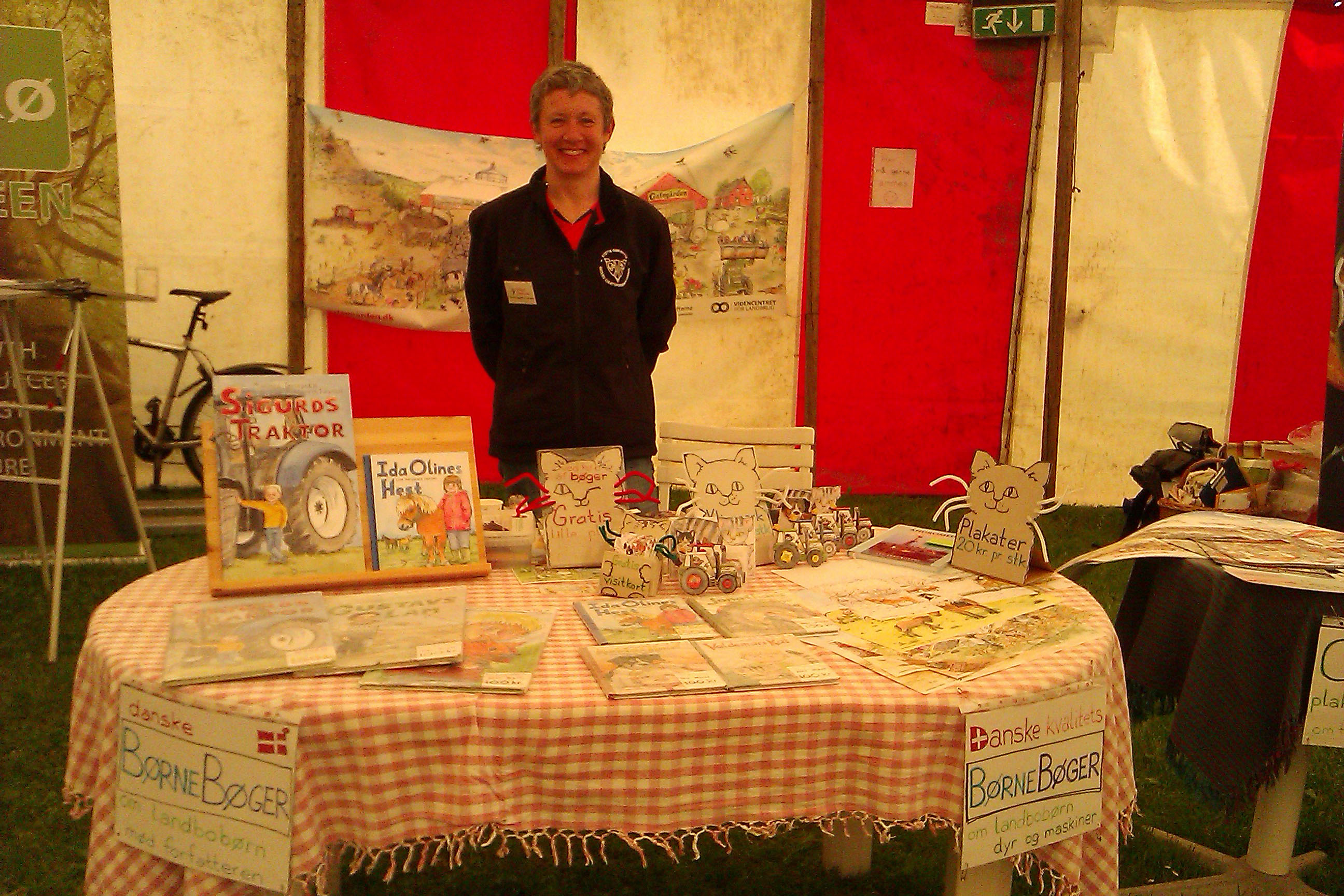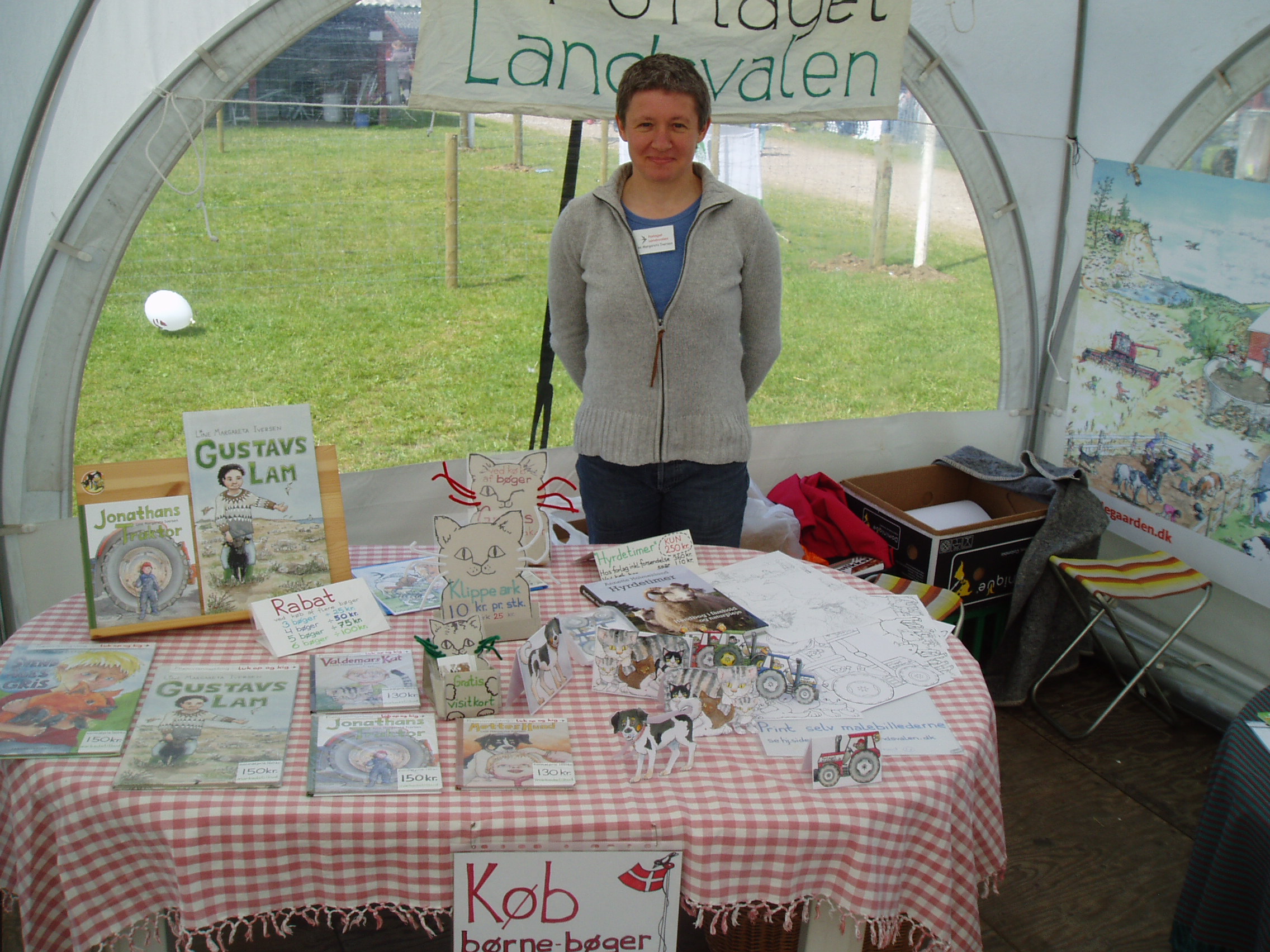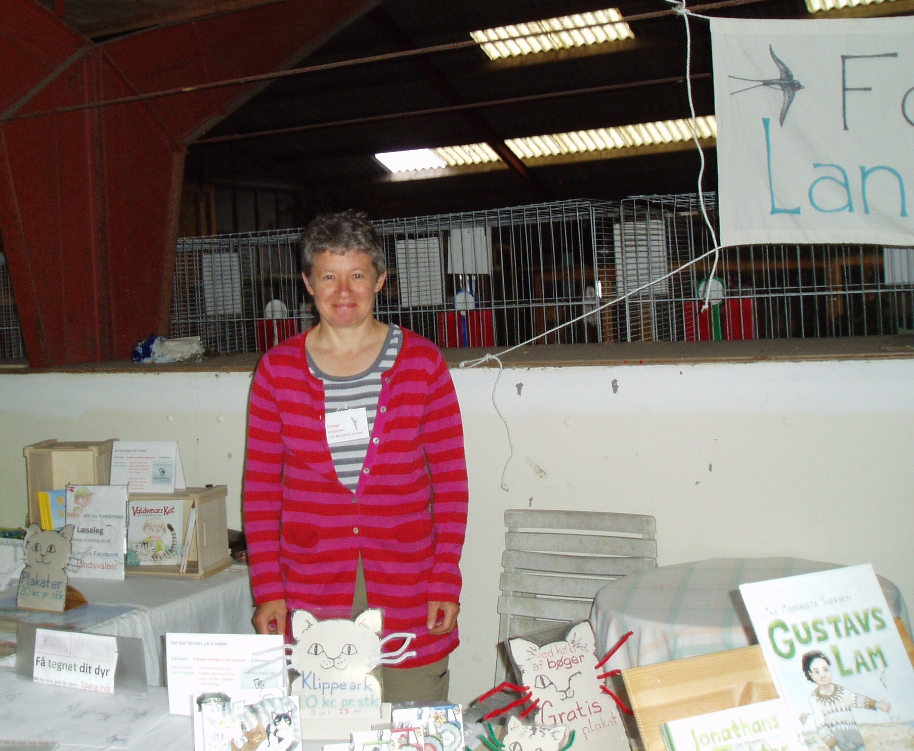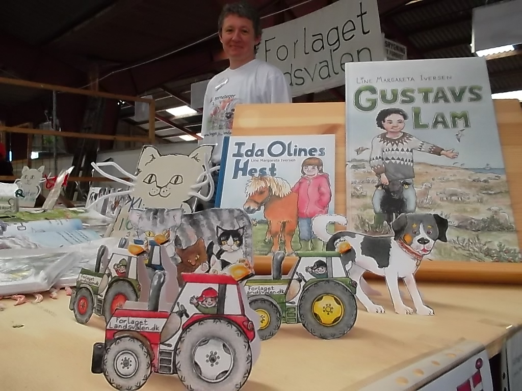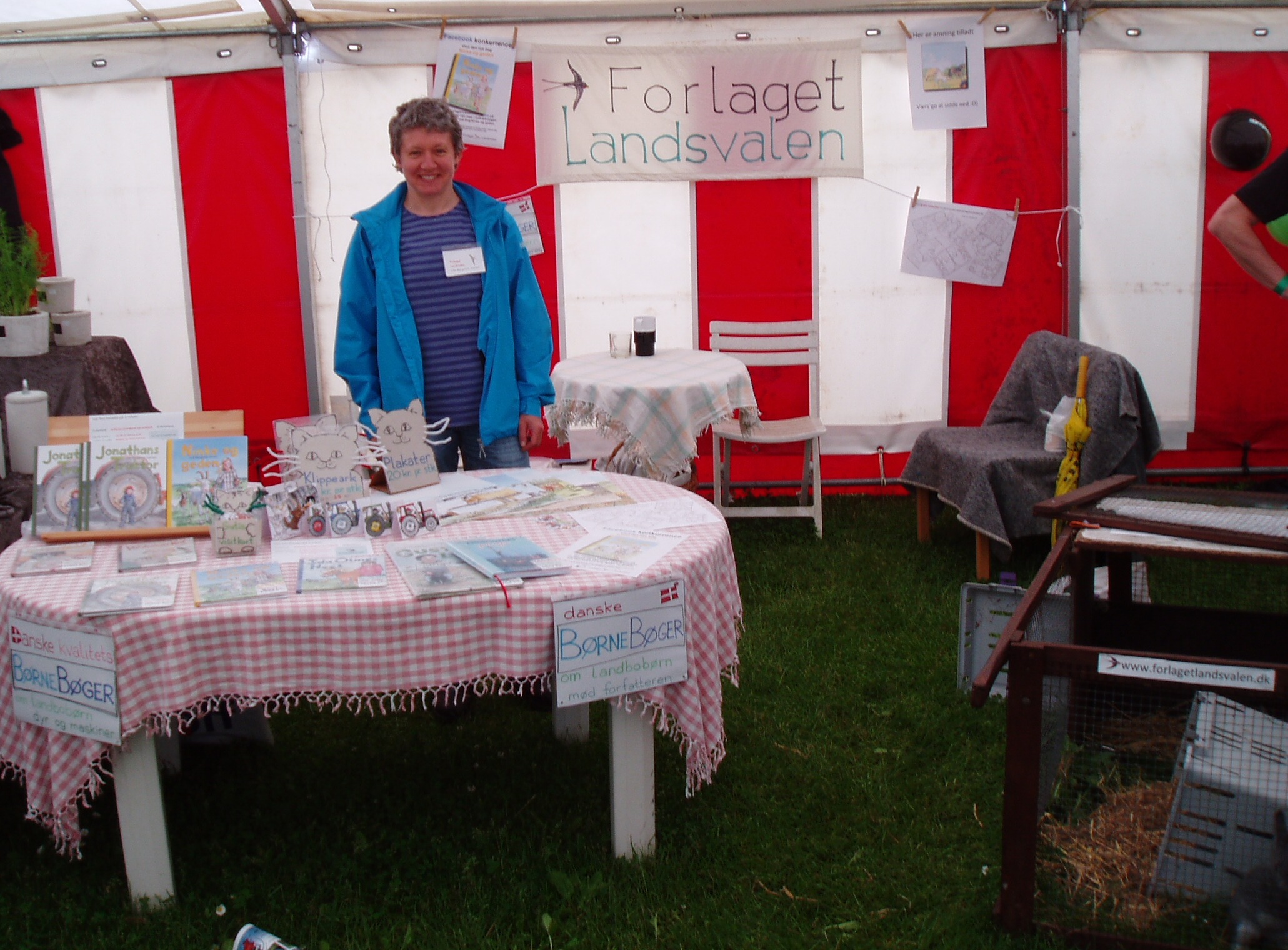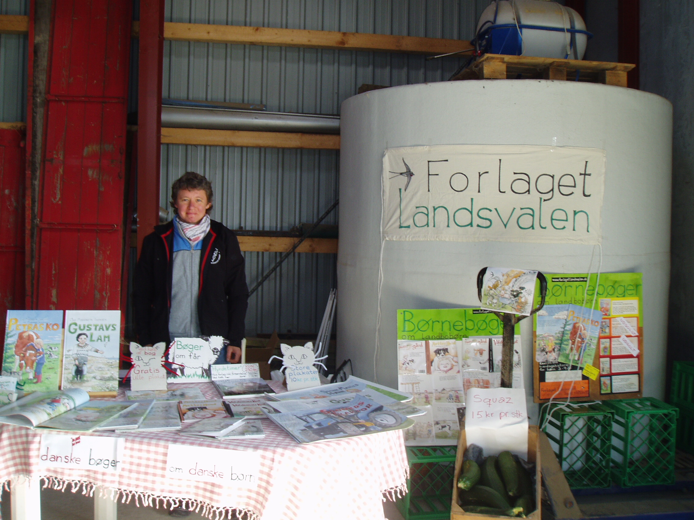 Forlaget Landsvalens stand på Livsstilsmarkedet, der havde til huse mellem staldene med brægende får og lam og stalden med kaglende høns, galende haner, pludrende klakuner, samt de mere stilfærdige kaniner.