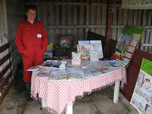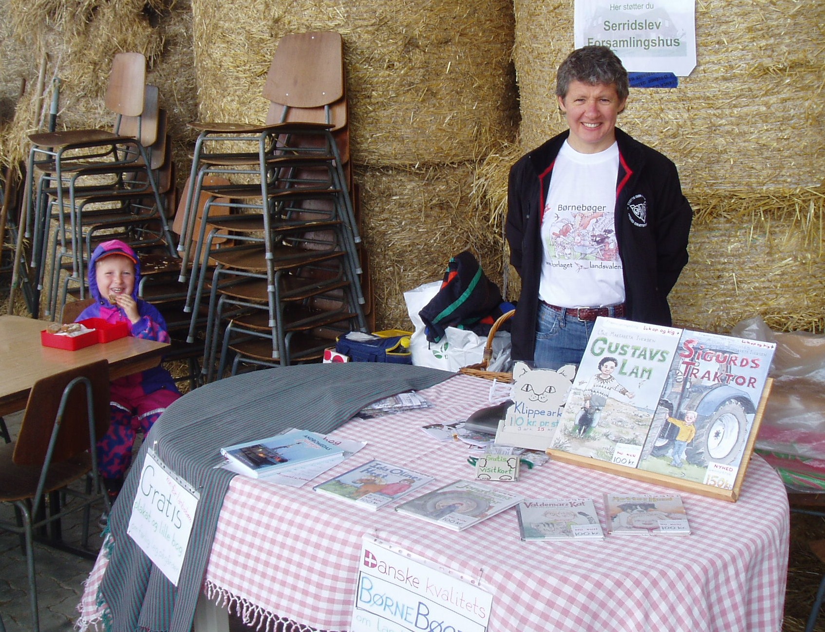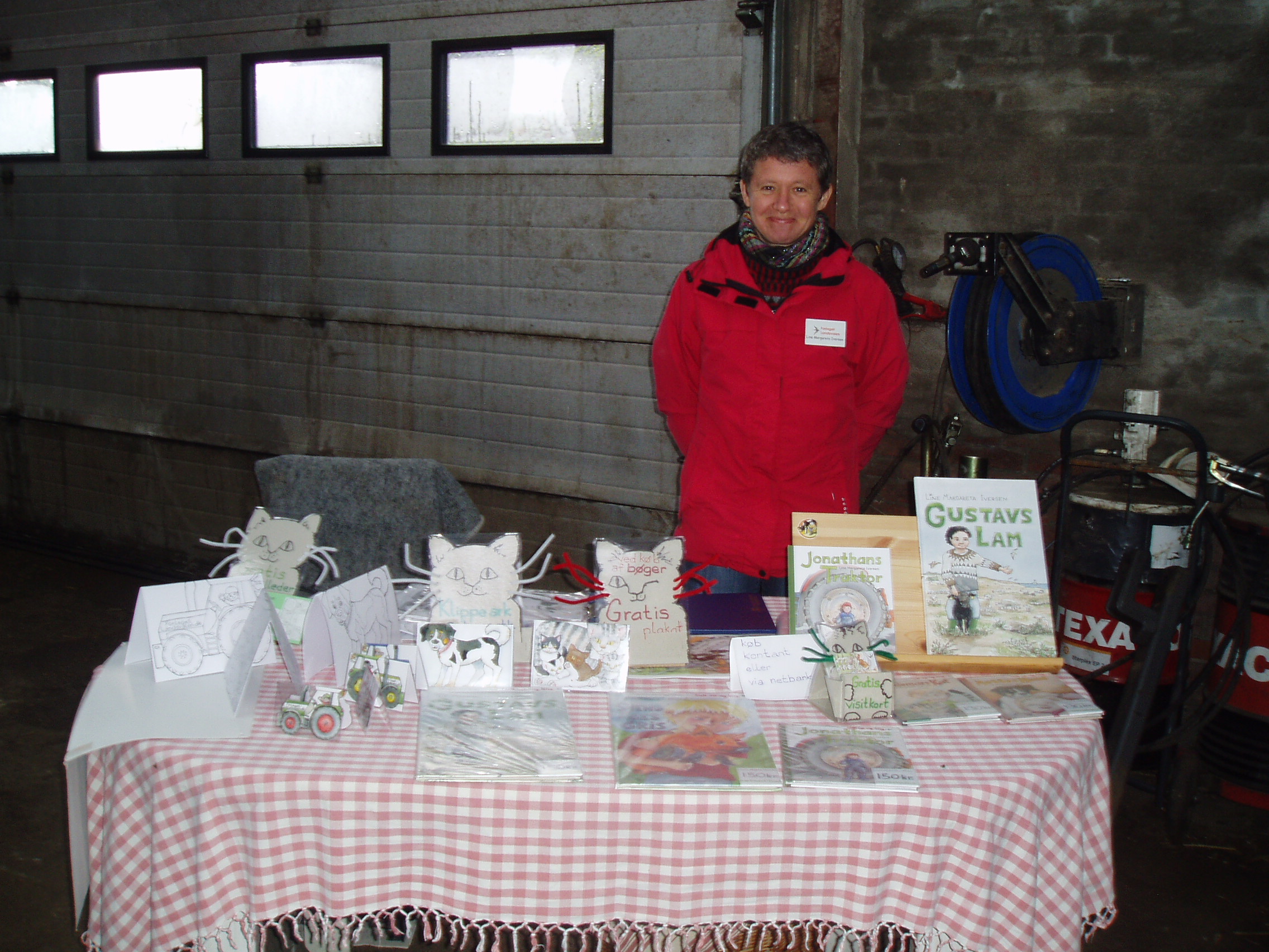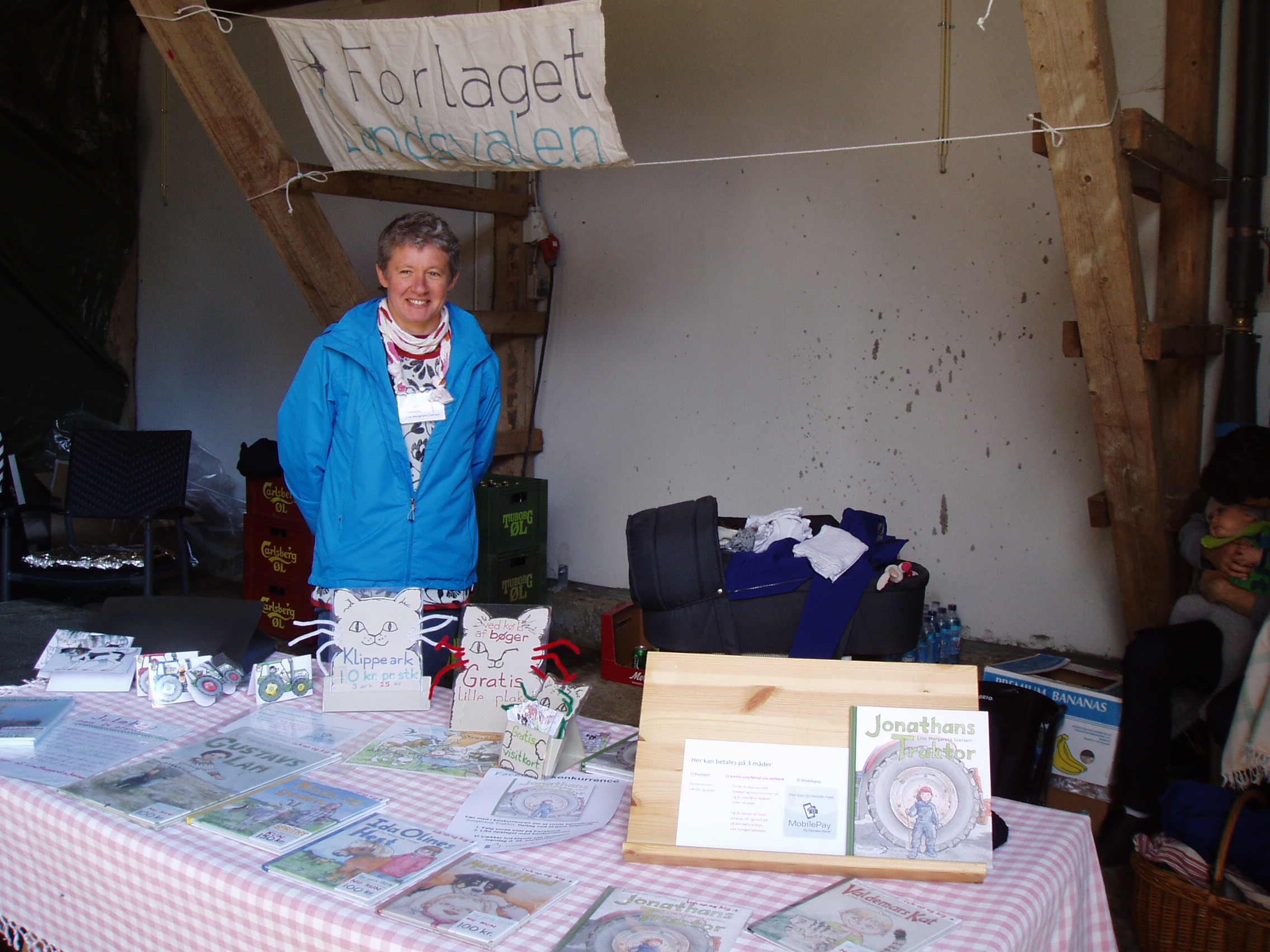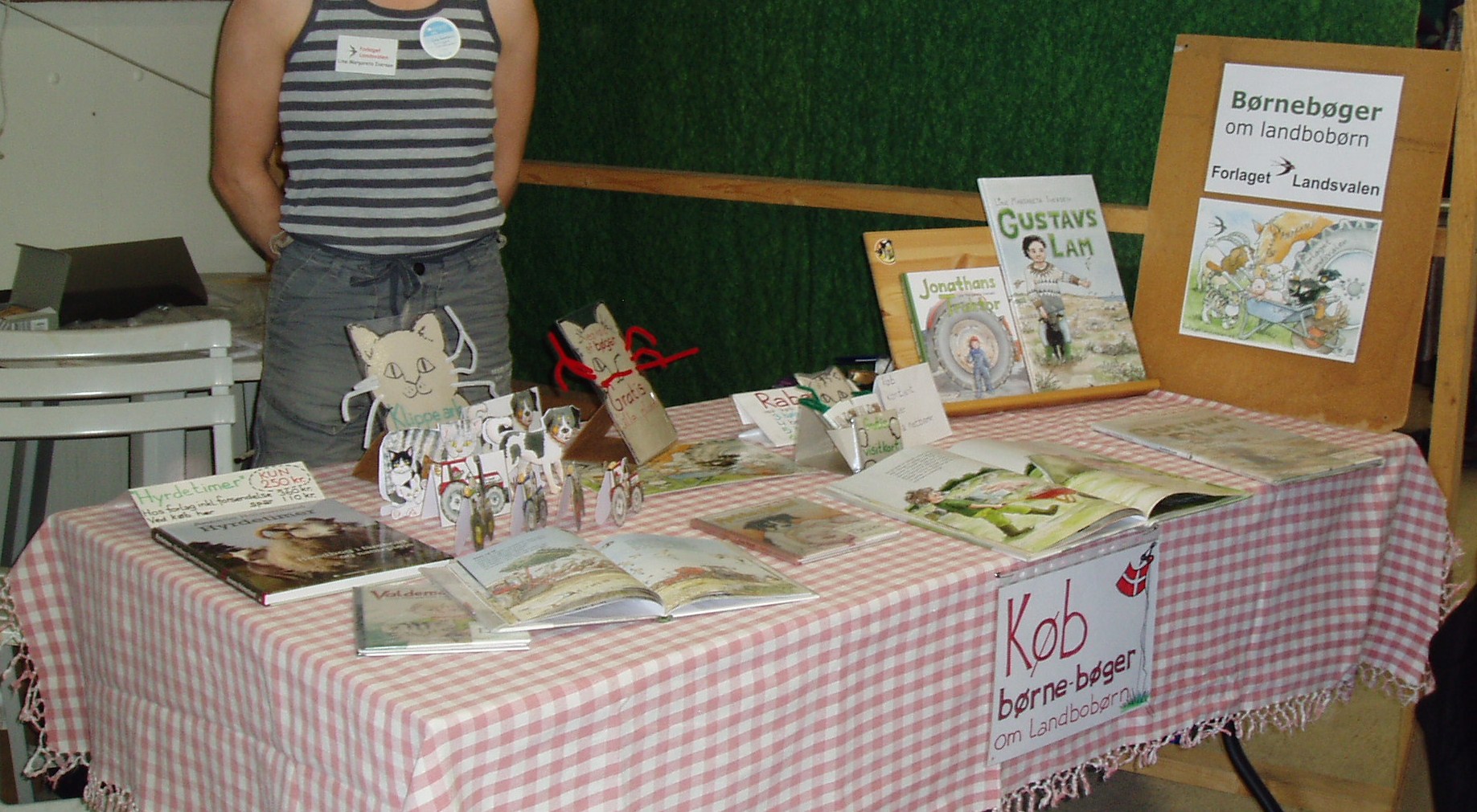 Forlaget Landsvalens stand på Livsstilsmarkedet, der havde til huse mellem staldene med brægende får og lam og stalden med kaglende høns, galende haner, pludrende klakuner, samt de mere stilfærdige kaniner.